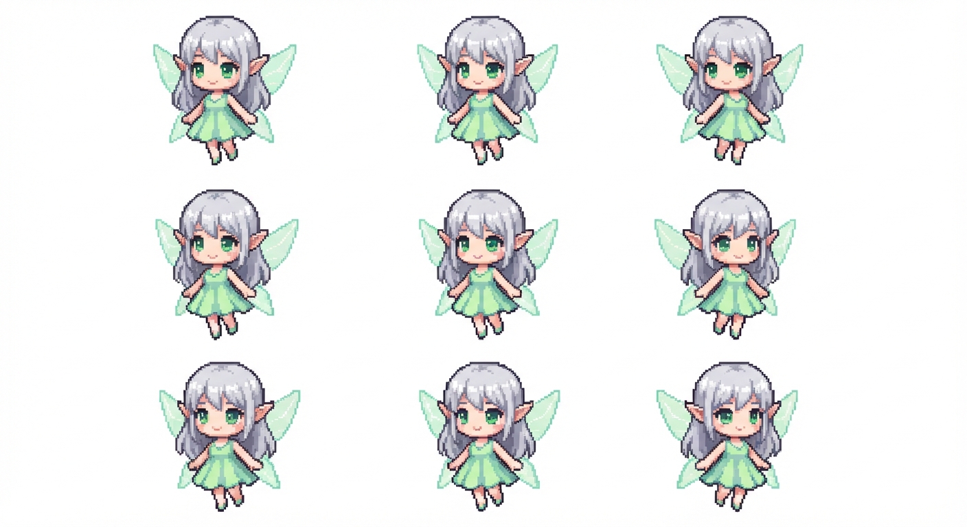 "cute little anime girl fairy with pointy elf ears, who has silver hair and green eyes, in Pixel Art style"
