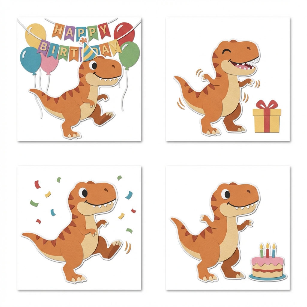 "a danning baby t-rex on a kids birthday party, in Cut-Out Art style"