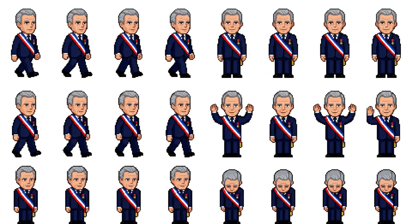 "a character looking like a president, wearing distinctive french attributes, in Pixel Art style"
