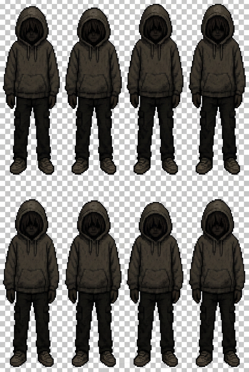 "Create a 2D pixel-art idle breathing animation spritesheet of the provided character. Keep the exact same proportions, colors, shading, hood shape, clothing folds, and silhouette. Animation: smooth and subtle breathing loop. Slight chest expansion, minimal shoulder rise, tiny head bob (very subtle). No movement of arms or legs. Style: same pixel density and shading as the reference. Frames: 8 frames Background: transparent. Consistency: no changes in colors, anatomy, lighting, or silhouette between frames. "