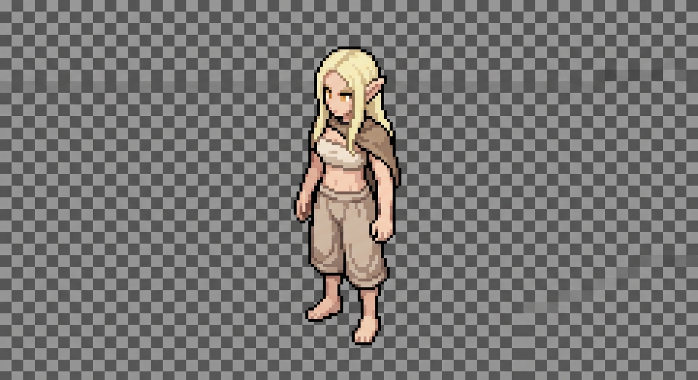 "Create a STRICT 64x64 authentic pixel art character sprite for a retro tactical RPG. Character: female Aestari with long pale blond hair, elongated pointed ears, asymmetrical cranial mantle, refined slender build, pale skin, amber eyes. Pose and view: full body, standing idle pose, facing south-east, isometric orthographic game sprite view, hands empty, centered in frame, entire figure fully visible. Clothing: basic medieval underwear only, simple linen bandeau and loose knee-length undergarment trousers, modest and utilitarian, no armor, no jewelry, no props. Pixel art rules: real hand-crafted pixel art sprite, hard clean pixel edges, no painterly rendering, no soft shading, no airbrush, no blur, no antialiasing, no subpixel detail, no texture noise, no high-detail illustration. Use large deliberate pixel clusters, readable silhouette, simple material rendering, limited palette, 3 to 4 values per material, minimal facial detail, minimal folds, classic 1990s tactical RPG sprite logic. Output rules: transparent background, no background elements, no glow, no vignette, no cast shadow outside the sprite, no extra objects, no text, no border., in Isometric Art style"