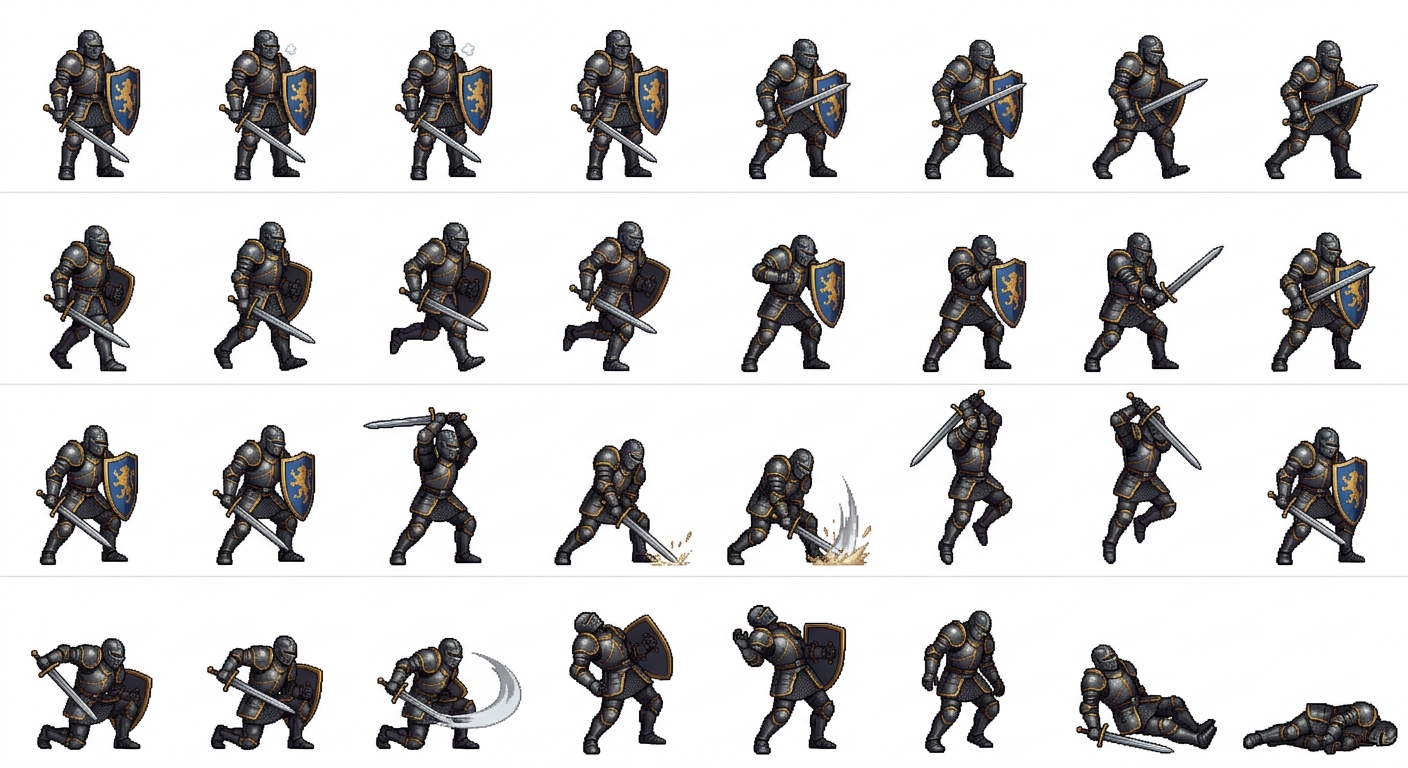 "I need a sprites for idle , walk , running , block , attack , a heavy attack ,a air attack, a low ground attack , taking damage sprite ,a dead sprite . All of this for a knight in full armor with a shield and a sword "