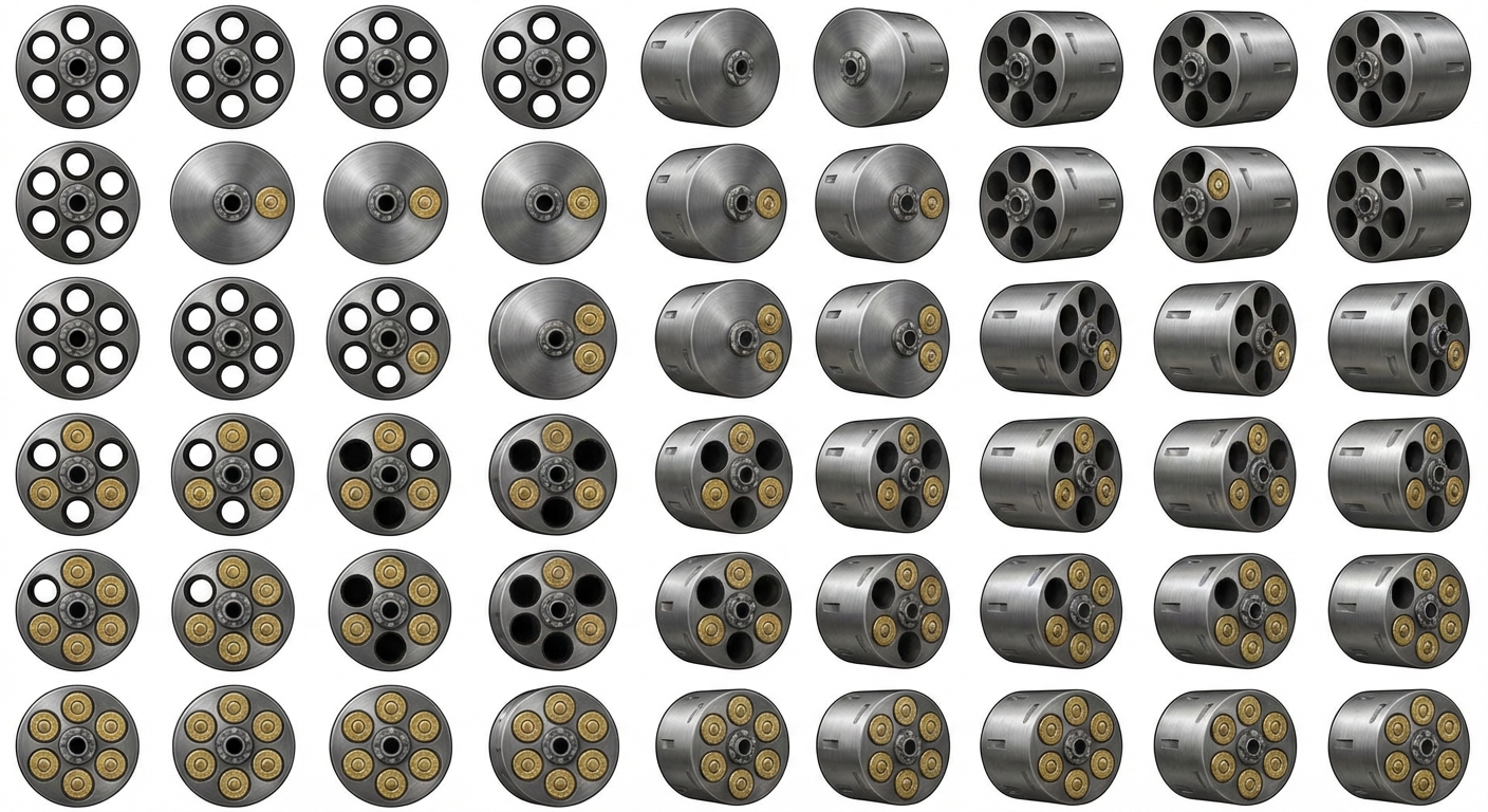 "revolver cylinder with 0-6 bullets loaded, with spinning animation, viewed from the back so you can see the butt of the bullets."