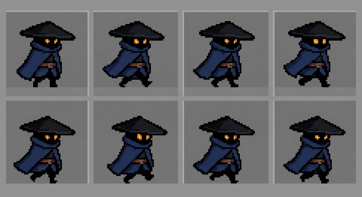 ""A high-quality 2D pixel art sprite sheet for a side-scrolling game. The character is a mysterious small figure wearing a wide-brimmed black ronin hat, glowing yellow eyes visible from the shadows, and a flowing dark blue cloak with a leather belt. Style: Clean pixel art with bold black outlines, high contrast, and a limited color palette (navy blue, black, amber, and brown). Layout: A single horizontal row of 8 animation frames showing a smooth walking cycle from a side-profile perspective. Background: Solid flat grey or transparent. Each frame should be perfectly centered within its own grid space to ensure consistent 2D animation.", in Vexel Art style"