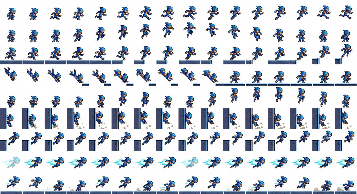 "the sprite sheet showing movements below each movement should occupy a single row thats 9 rows and should have atleast 12 frames thats 12 columns Tight acceleration ✅ row 1 Air control ✅ row 2 Coyote time ✅ row 3 Jump buffering ✅ row 4 Variable jump height ✅ row 5 Wall slide ✅ row 6 Wall jump ✅ row 7 Directional dash ✅ row 8 Dash reset on ground row 9"