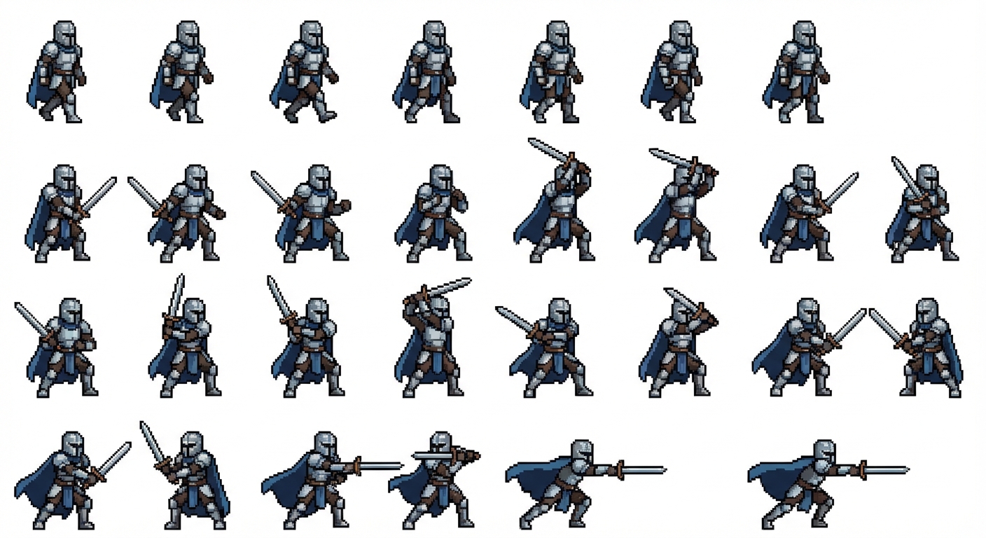 "Armored knight walking and sword fighting animation sheet, in Pixel Art style"