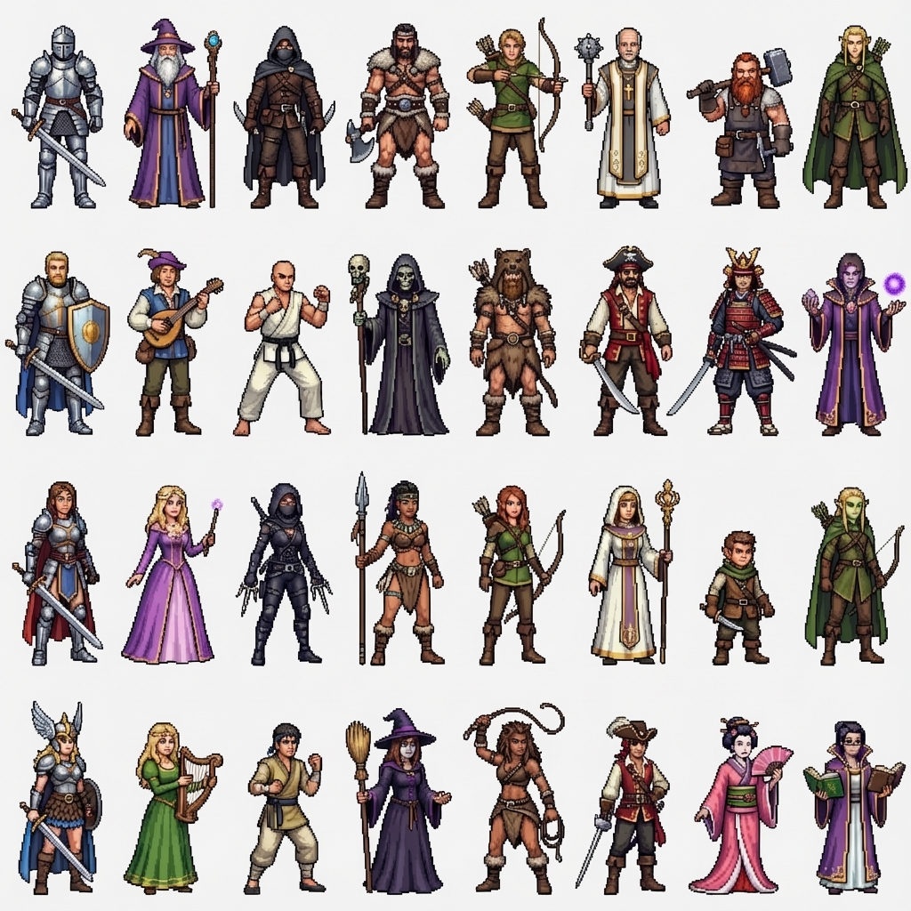 "I need a 1024x1024 sprite sheet with transparent background that consists of 32 frames, 8 columns and 4 rows of 128w x 256h sprites. These are to be Hi-res pixel art RPG Fantasy heroes with lots of diversity and flavor. 16 males and 16 females to keep it even. "