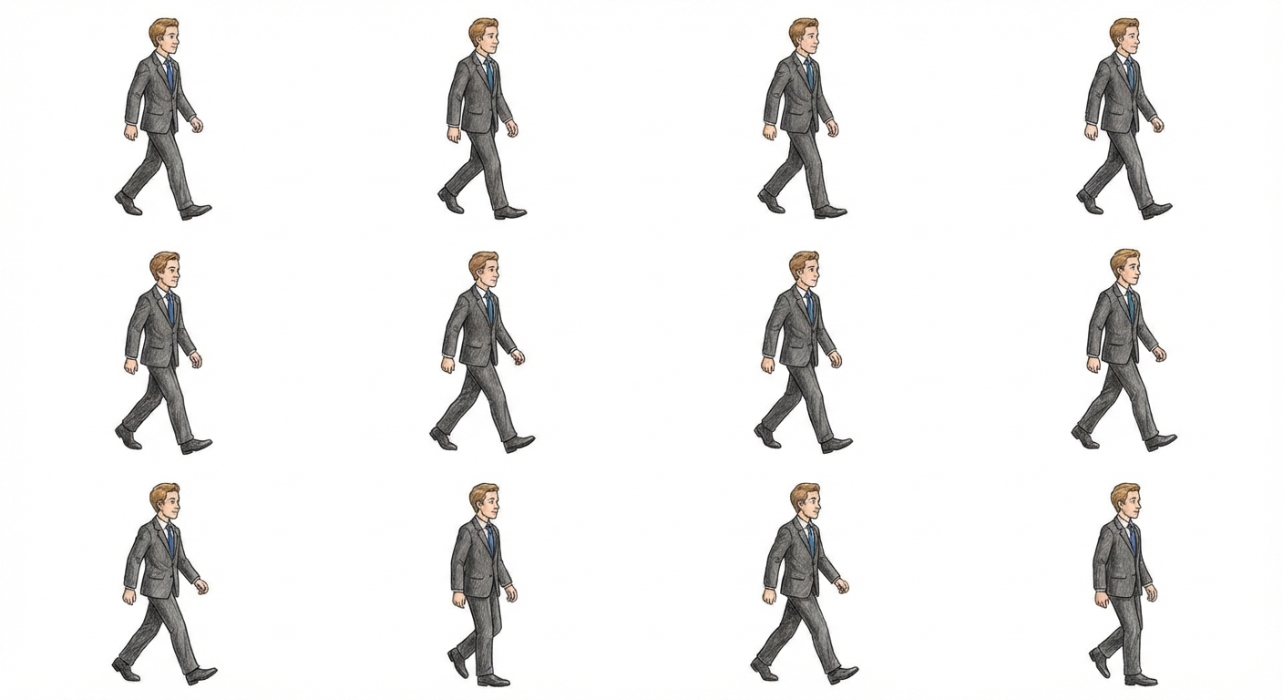"a character man with light brown hair in a suit walking, in Hand-Drawn Art style"