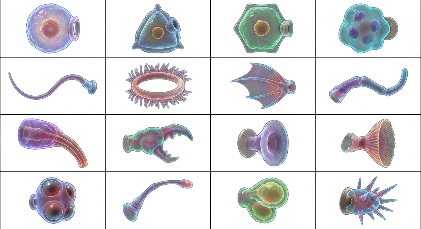 "Generate a set of modular microorganism body-part sprites designed for a procedural evolution simulator where creatures are assembled from interchangeable biological components. ART STYLE Stylized microscopic life inspired by microscope photography, sci-fi biology, and games like Spore. Organic, colorful, semi-transparent membranes with soft glowing edges and subtle biological textures. Slightly cartoony but believable, visually readable at small scale. VIEW Top-down view. Each sprite centered in the image. Designed so parts can be rotated and attached to a central organism body. SPRITE REQUIREMENTS • transparent background • centered pivot • consistent lighting across all sprites • no shadows outside the sprite • minimal empty space so sprites pack well into a texture atlas • consistent scale across all sprites • designed to connect to other parts through visible organic attachment points ATTACHMENT DESIGN Every part should include a visible biological connector where it would attach to another part or to the organism’s core body. Connector examples: • membrane joint • organic socket • soft tissue ring • cartilage connector • circular anchor pad These connectors should be visually clear so the sprites can be assembled procedurally by a game engine. SPRITE SIZE 512 x 512 pixels transparent background ATLAS FRIENDLY Sprites should be tightly framed with minimal empty space so they can be packed efficiently into a sprite atlas for use in WebGL or BabylonJS. GENERATE MULTIPLE PART CATEGORIES 1. CELL BODY CORES Main organism bodies that other parts attach to. Examples: round jelly cell triangular armored cell hexagonal cell multi-nucleus blob spiky membrane cell thick shell cell elongated amoeba cell soft gelatin cell segmented cell crystalline alien cell 2. LOCOMOTION APPENDAGES Parts used for movement. Examples: long flagella short flagella multiple flagella cluster cilia ring tentacle legs membrane fins pseudo-legs whip tail multi-joint tentacle swimming fins 3. FEEDING / MANIPULATION APPENDAGES Examples: feeding proboscis grabbing claw micro pincers suction tube split tentacle suction pad hook appendage filter feeding fan 4. SENSORY ORGANS Examples: eye cluster antenna chemical receptor node glowing sensory bulb heat sensor magnetic sensor vibration sensor light detecting eye stalk 5. DEFENSIVE STRUCTURES Examples: spikes toxin sacs shell plates armor ridges venom gland electric discharge node defensive barbs protective crystal shell VISUAL DETAILS • vibrant microscopic colors • glowing membranes • organic textures • soft shading • subtle translucency • readable silhouettes • believable biological design VARIANTS Each type of appendage should have multiple mutation variants such as: short long thick thin split clustered armored spiked OUTPUT Generate approximately 16 unique sprites for each category while keeping a consistent art style across all sprites so they can be mixed and matched when constructing procedural organisms."