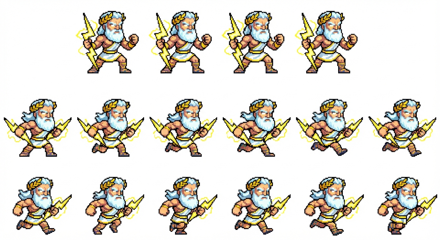 "2D side-scrolling platform fighter character sprite, Zeus from Greek mythology, Brawlhalla art style, 8-bit pixel art. Small body with oversized heroic head, flowing white glowing beard, muscular build wearing gold laurel crown and white toga with gold trim. In his right hand, he holds a solidified, sharp-edged lightning bolt as a physical weapon; the bolt is a distinct, sharp yellow "Z" shape for instant recognition. Dynamic combat stance, sharp pixel edges, limited color palette, vibrant yellow electricity crackling around the bolt. Flat lighting, high contrast, transparent background. with idle and running animation of the sprite"