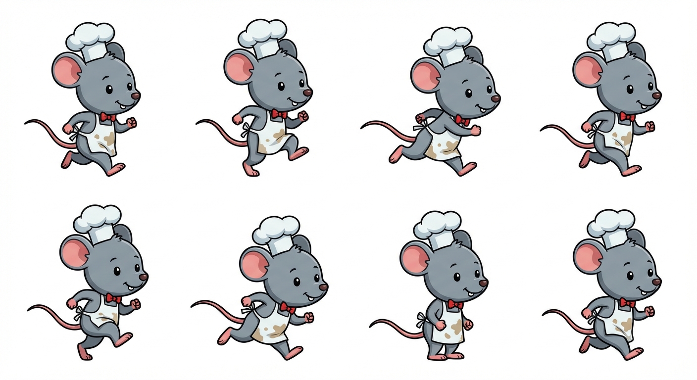 "Um rato cinza, com roupas de cozinheiro, uma gravatinha vermelha e uma cabeça bem grande Ele é anãozinho e no estilo Cartoon"