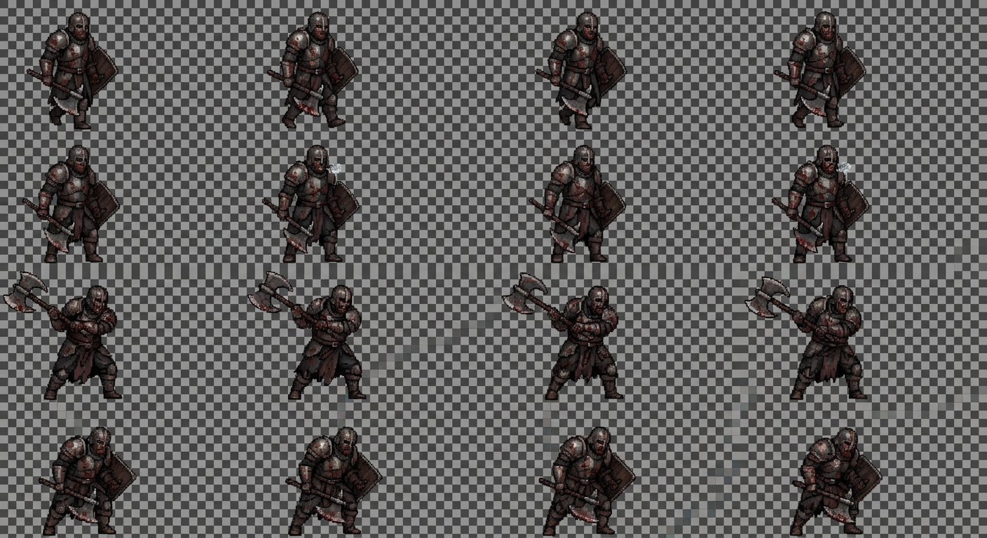 "64x64 pixel art character sprite, full body, transparent background, dark fantasy grimdark, brutal war-worn style, tactics ogre + fft inspired silhouette clarity, hard pixel edges, no anti-aliasing, 1px near-black outline, limited muted palette, damaged armor, cloth tears, dried blood, ash, readable class silhouette, game-ready sprite sheet style., in Pixel Art style"