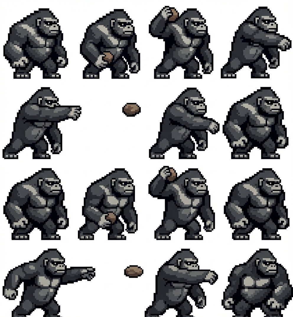 "genera degli sprite del gorilla, che muove le braccia, come se stesse lanciando delle pietre davanti a se, non verso il basso, in Pixel Art style"