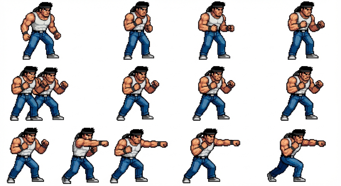 "A pixel art street fighter. Black headbank, white wifebeater shirt, muscilar, jeans."