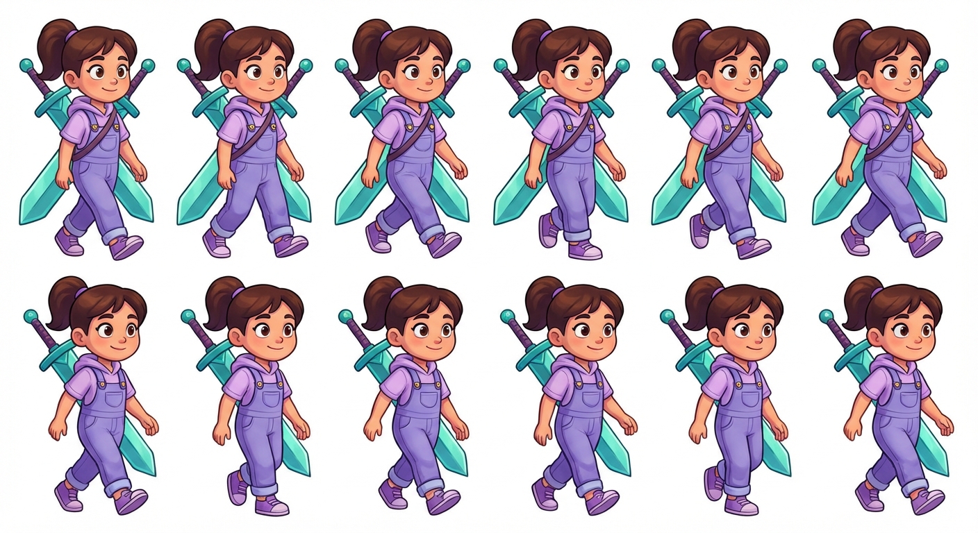 "A young girl wearing lavender clothing. She has a vibrant aquamarine great sword slung across her back.. A 2D game character in modern cartoon style, bold shapes, soft shading, smooth curves and vibrant colors."