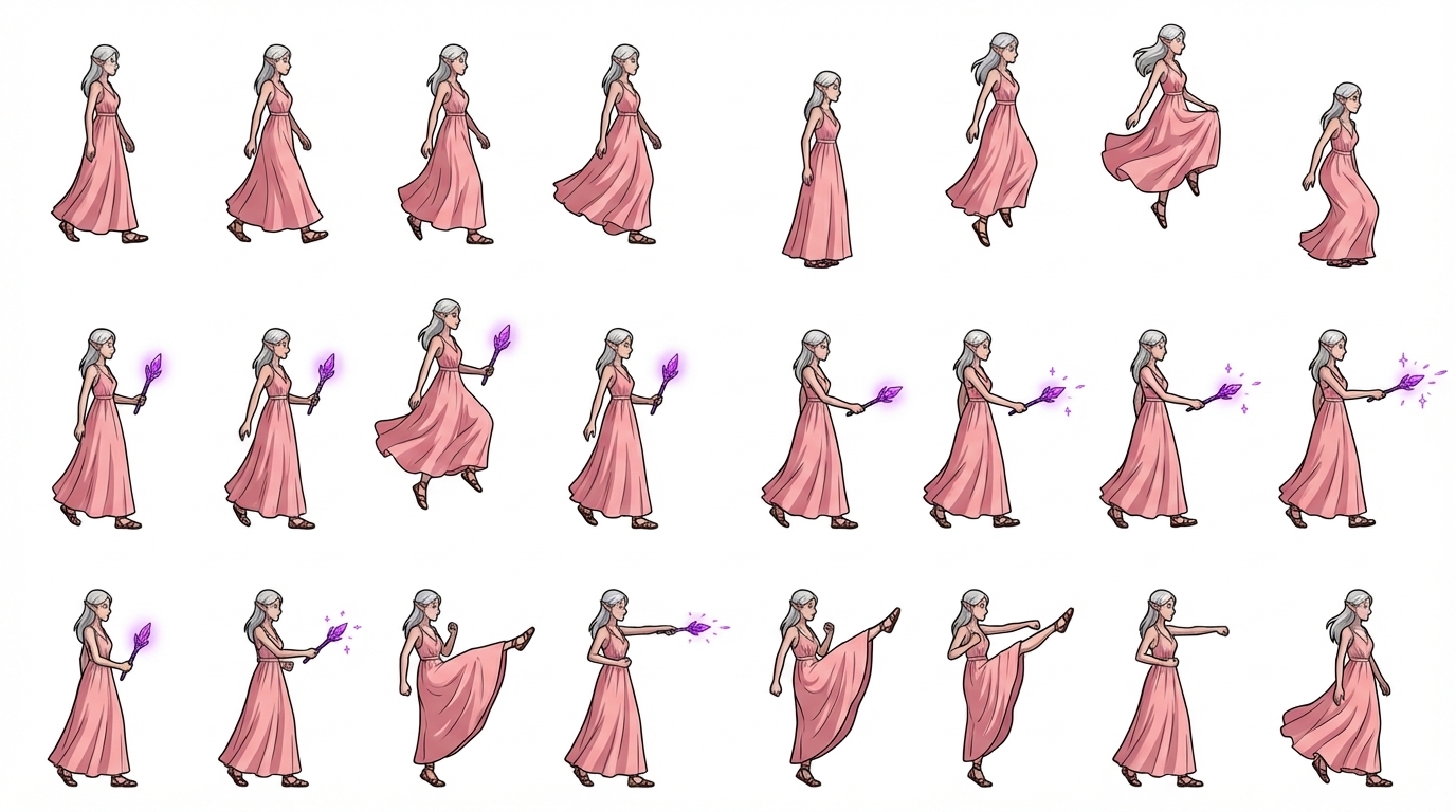 "Sprite sheet of a silver-haired elf lady in a pink dress, white background. Walk: Graceful rhythmic stride. Jump: Vertical leap with flowing dress physics. Magic Walk: Walking while holding a glowing purple crystalline magic wand in her right hand. Wand Attack: Walking with her right arm extended, pointing the purple wand forward, purple sparks emitting. Kick: High-front martial arts kick, dress flowing with the motion. Consistent character design, flat lighting, 2D game asset style, high-contrast silhouettes."
