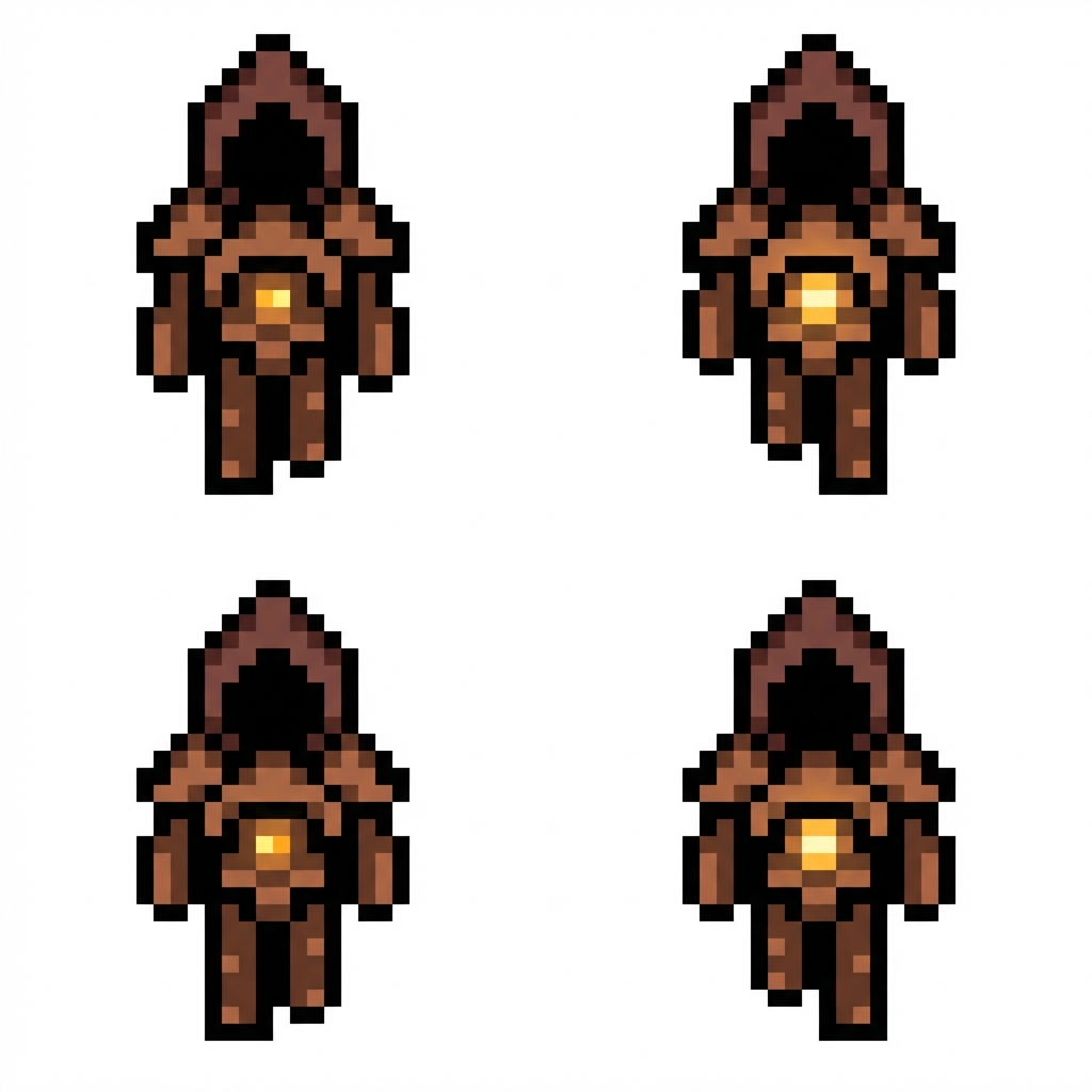 "hooded figure with light built into outfit. Walking towards camera, in Pixel Art style"