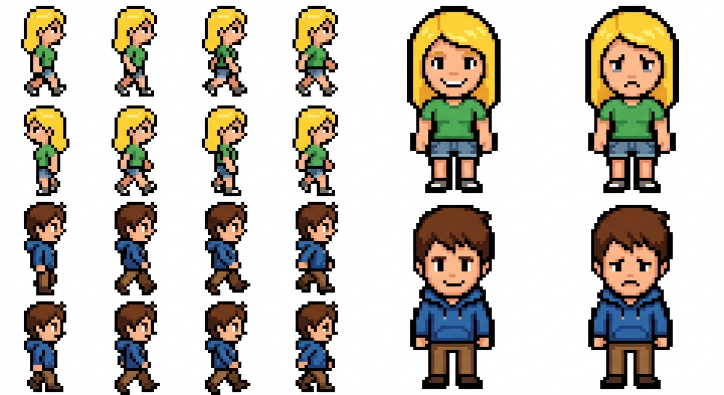 "Create a female character and a male character, the female is blonde and wears shorts, and the male wears pants. I want you to create 4 side outfits so that later I can make the character walk, and I need one outfit facing forward smiling and one sad."