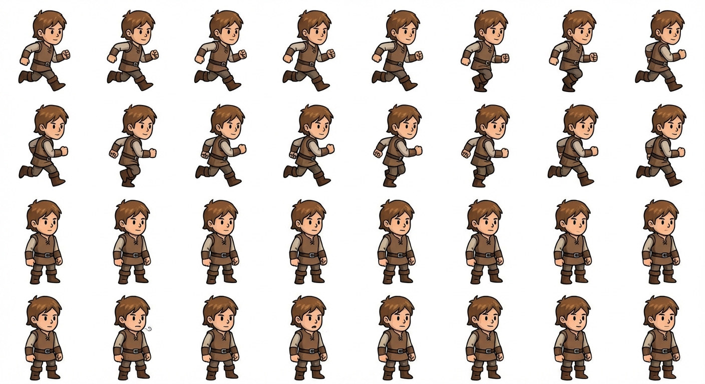 "I want an extremely smooth player animation left to right sprite. not too detailed, simple style but also slightly shaded with depth. should be a basic knight with no helmet and brown hair with basic leather clothing, nothing special at all. include idles as well."