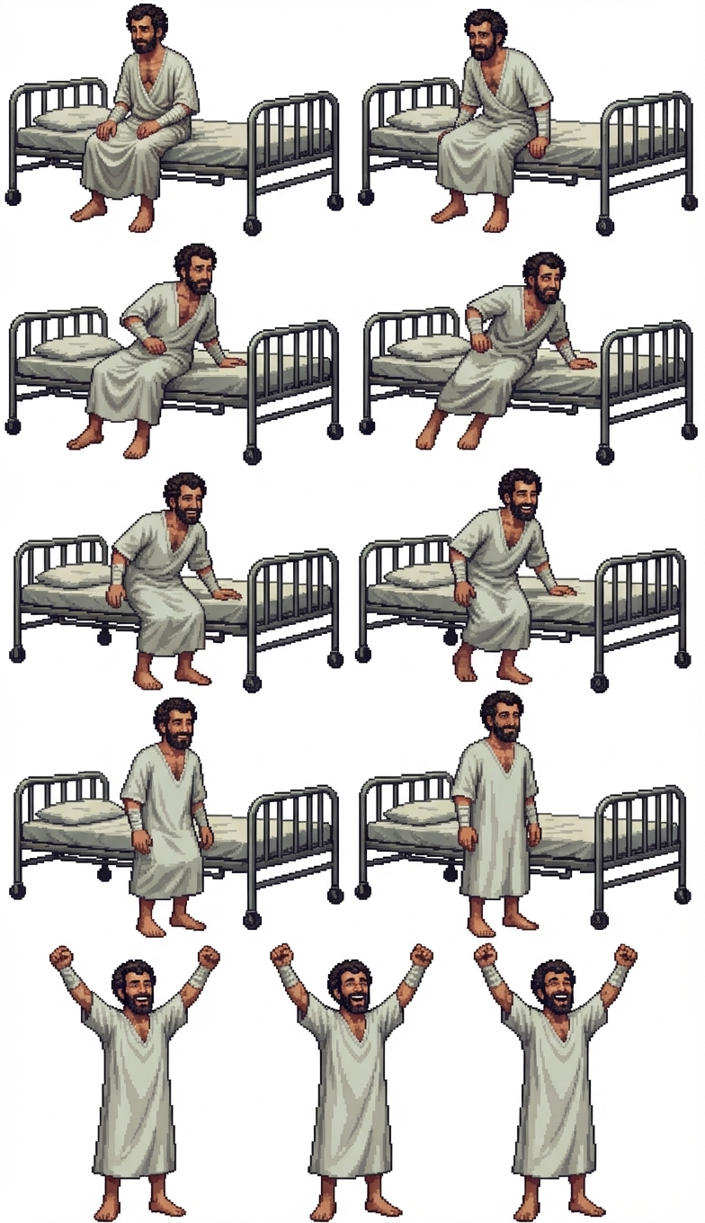 "haz que el paciente se levante y se ponga de pie alegre por su recuperacion, con 12 fotogramas "