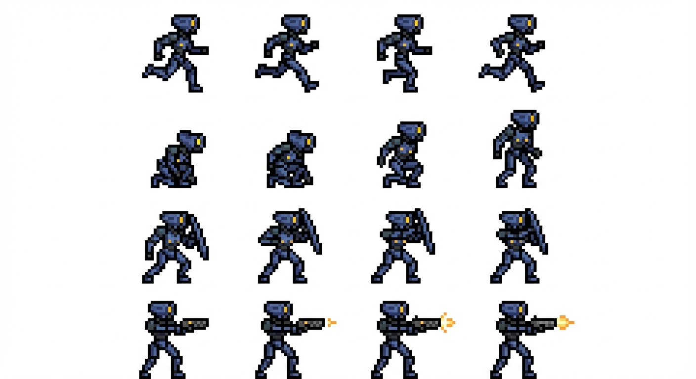 "can you make an pixel art style an use the cacharter V1 from the game ultrakill and an animation for shooting running blocking and crouching and make sure to always show the full body"