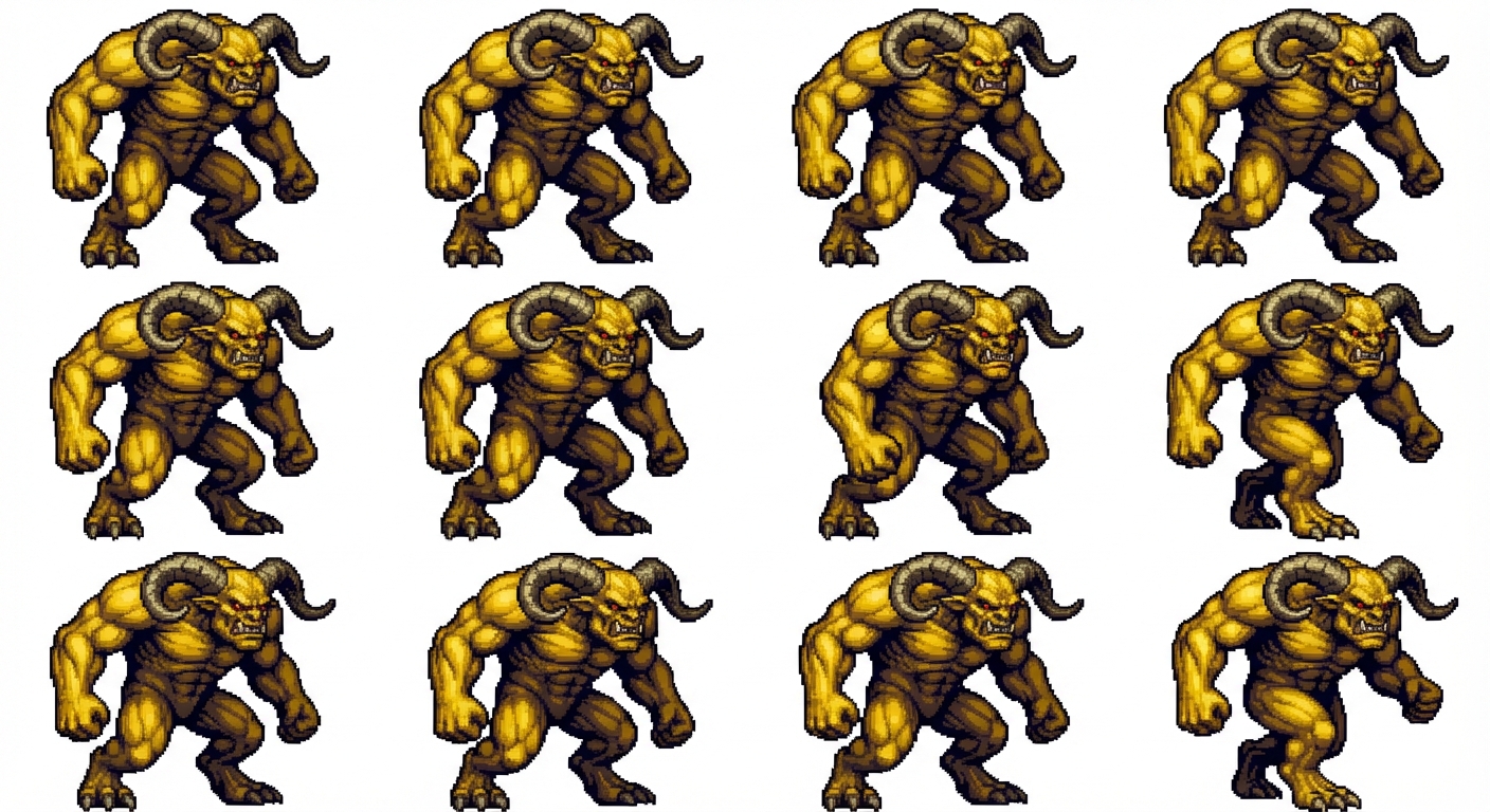 ""Create a realistic yellow monster in pixel art, heavily muscular, with large curved horns and an intimidating, powerful face. The creature should look aggressive and dominant. Generate a full walking animation with multiple frames, showing strong, weighty movement. Style: detailed, high‑contrast, 16‑bit realism.""