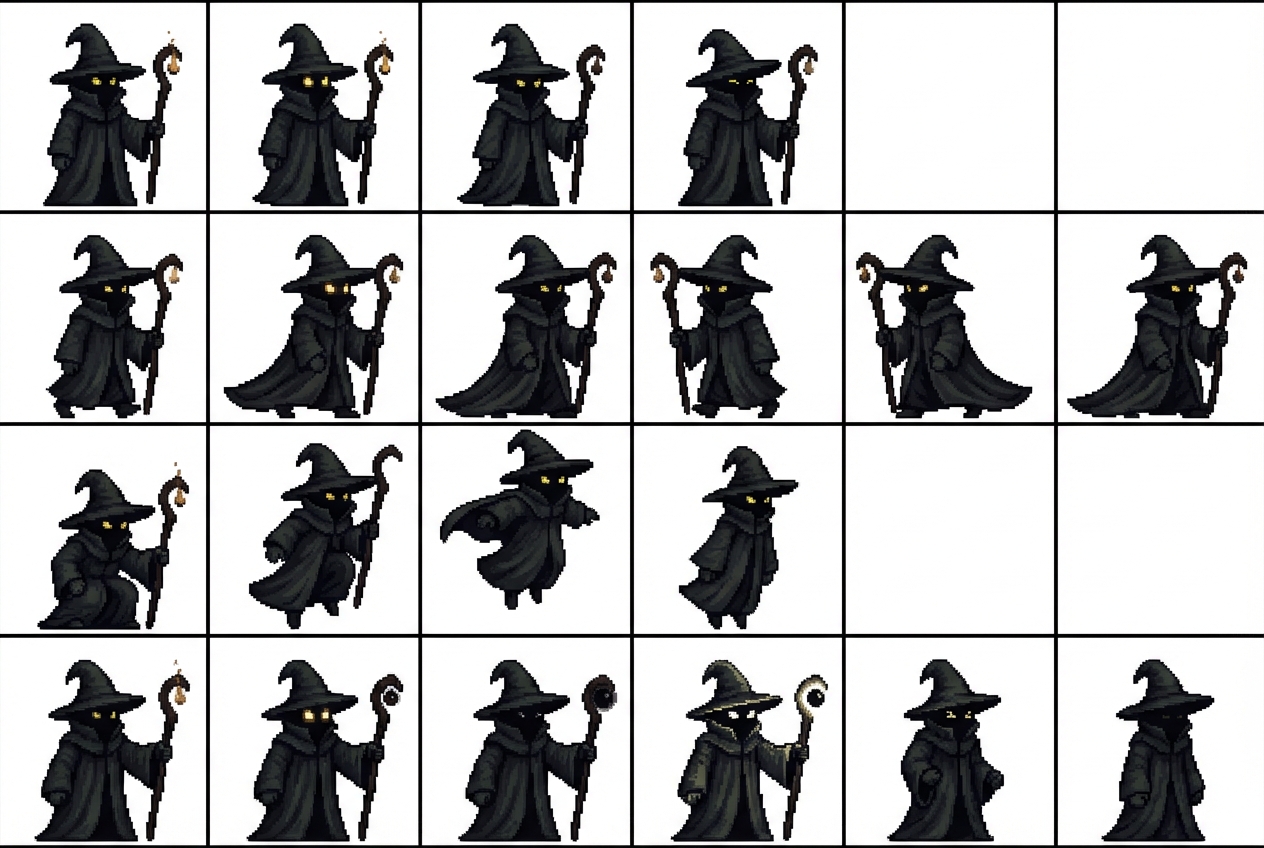 "# š§ Dark Fantasy Wizard ā 32Ć32 Sprite Sheet ### šØ Visual Style * **32Ć32 pixels per frame** * Dark, desaturated palette * Heavy shadowing (top-down light source) * Oversized pointed hat obscuring face * Glowing yellow or cyan eyes (2ā3 pixels each) * Long tattered robes that drag on ground * Staff slightly crooked, faint magical ember glow * Subtle robe physics (trailing cloth) --- # š Sprite Sheet Layout **Canvas Size:** 192 Ć 128 px (6 columns Ć 4 rows of 32px frames) ``` Row 1: Idle (4 frames, leave last 2 empty or duplicate) Row 2: Walk (6 frames) Row 3: Jump (4 frames, last 2 empty) Row 4: Cast Spell (6 frames) ``` Total used frames: 20 --- # šÆ Animation Design (Dark Fantasy Feel) ## š¤ Idle (4 frames) 1. Subtle robe sway (1px movement at bottom hem) 2. Eyes flicker brighter 3. Tiny cloth drag shift 4. Micro hat dip (breathing effect) š Keep movement minimal and eerie. --- ## š¶ Walk (6 frames) * Feet barely visible under robe * Robe bottom stretches backward on forward step * Frame 3 & 6 = strongest cloth drag * Hat bob is subtle, 1px vertical motion * Staff lags 1 frame behind body motion š The robe should feel heavy and slightly delayed. --- ## 𦓠Jump (4 frames) 1. Crouch (robe compresses 2px upward) 2. Lift-off (robe trails downward) 3. Mid-air float (cloak flares slightly) 4. Fall (robe sharply tapered beneath) š Keep legs mostly hidden ā silhouette matters more than detail. --- ## š„ Cast Spell (6 frames) 1. Staff lifts 2. Eyes brighten 3. Small dark orb forms (deep purple/blue core) 4. Bright rim light flash 5. Release frame (1ā2px recoil) 6. Robe settles slowly Optional: 1-frame pure white staff tip for impact punch. --- # šØ Recommended 32Ć32 Proportions * Hat: 12ā14px tall * Body: 14ā16px * Robe drag: bottom 4ā6px * Eyes: 2Ć2 pixels * Staff: 1px wide shaft Silhouette should read clearly even when zoomed out. MAKE SURE IT CAN BE ADAPTABLE TO BE A SHOOTER AS WELL, INT HE CODE, THE STAFF MOVES TO THE CURSOR"