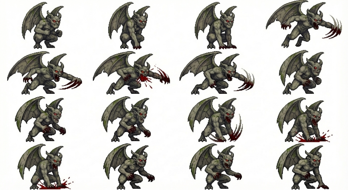 "gory gargoyle that does a leap attack animation 64x64 px, in Pixel Art style"