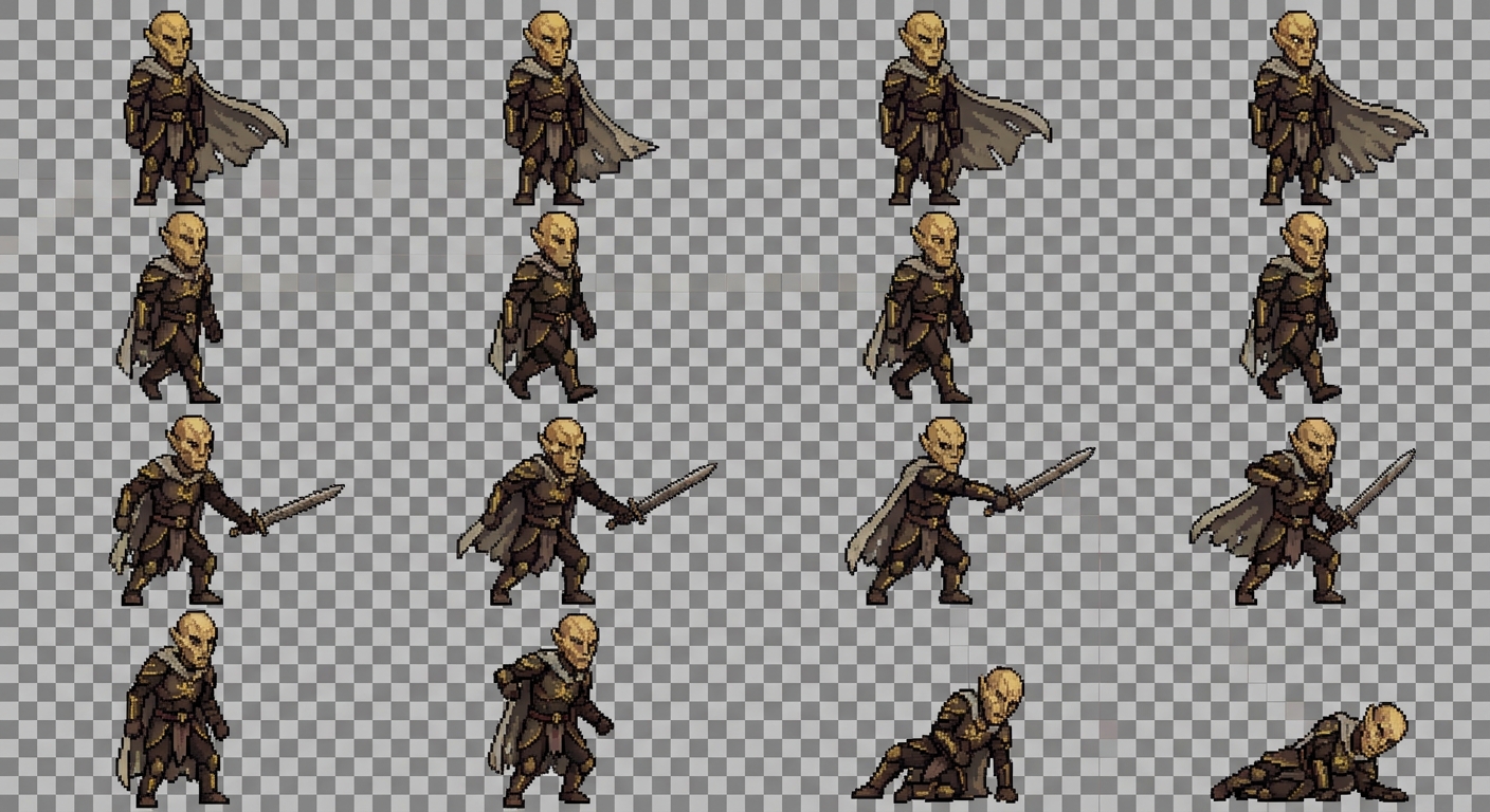 "64x64 pixel art character sprite, full body, transparent background, dark fantasy grimdark, brutal war-worn style, tactics ogre + fft inspired silhouette clarity, hard pixel edges, no anti-aliasing, 1px near-black outline, limited muted palette, damaged armor, cloth tears, dried blood, ash, readable class silhouette, game-ready sprite sheet style. Sun Elf (Solithiel) Gaunt tall elf, angular face, sun-scorched pale-gold skin, ritual scars, torn light-cloak, austere solar sigils, haunted eyes, noble but exhausted., in Pixel Art style"