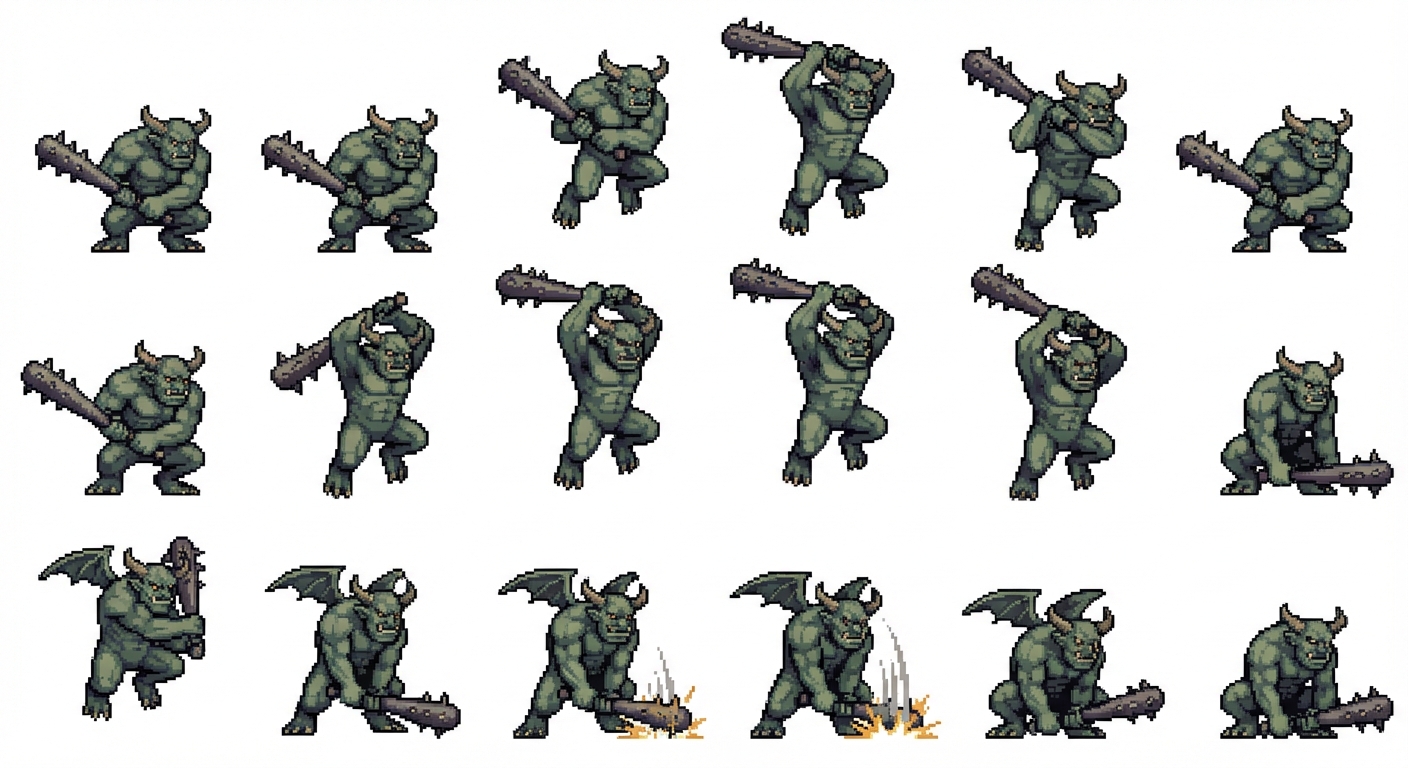 "Fantasy Retro RPG Monster, jump and then hit with his bat from up to down. Use a fixed style language and keep resolution constant. Apply this as an intentional prompt delta to reduce visual drift., in Pixel Art style"