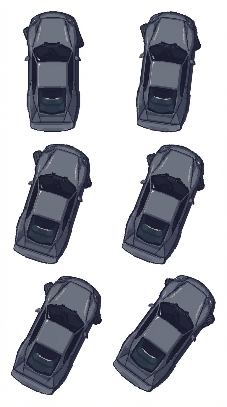 "I have given you the image of a pixellated car. Draw me 6 panels of the car turning to the right. 7.5 degrees in each cell. The car's body and the wheels should turn the same number of degrees. Cell 1 - car turning 7.5 degrees with wheels slightly out. Each pictures turns exponen tially more from the first, base picture i have shared. Cell 2 - Car turning 15 degrees, wheels more out. Cell 3 - Car turning 22.5 degrees, wheels more out Cell 4 - Car turning 30 degrees, wheels more out Cell 5 - Car turning 37.5 degrees, wheels more out Cell 6 - Car turning 45 degrees, wheels more out"