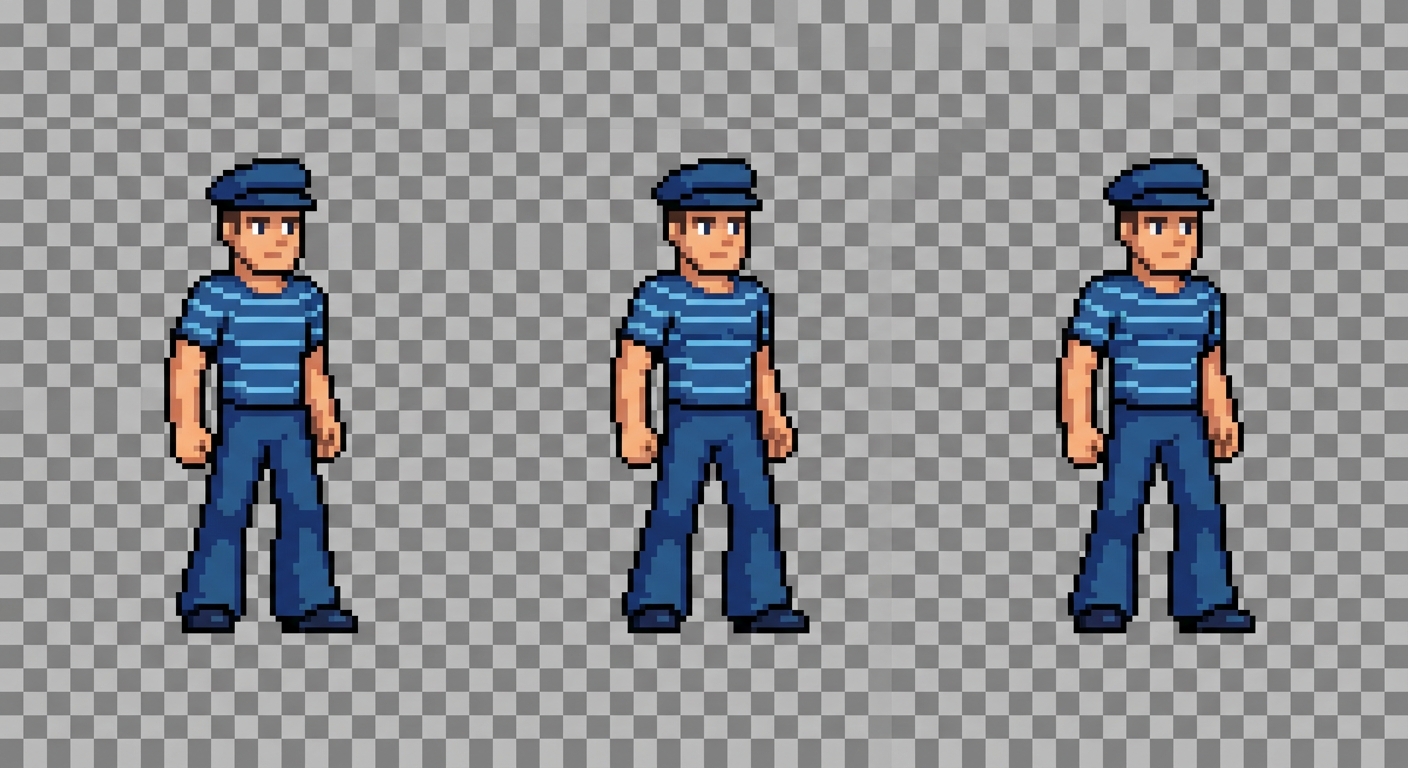 "pixel art sailor idle animation, subtle breathing motion, slight body shift left and right, 3 frames, consistent character, sprite sheet, transparent background"