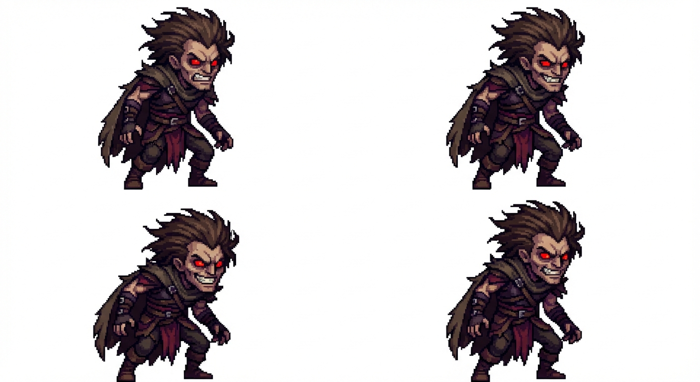 "Roughly 48–64 px tall Big heads, small bodies (2–2.5 heads tall) Exaggerated silhouettes Soft, rounded pixel clusters High readability even when zoomed out Hercules inspired but very stylized man, a predator‑like, violent, and unrestrained combat persona. lean, Predatory grin or snarl Eyes that look feral or unhinged Hair often messy, wild, or spiked — reinforcing the “untamed” theme His outfit usually mixes: asymmetrical layers torn or rugged elements straps, belts, or bindings dark tones with violent accent colors (reds, blacks, deep purples), in Pixel Art style"