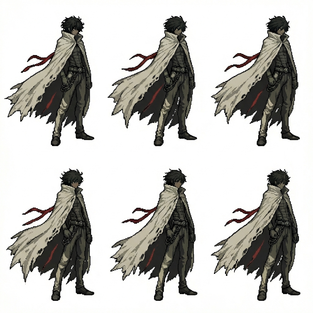 "Remove the weapon and add movement to the cape , in Pixel Art style"