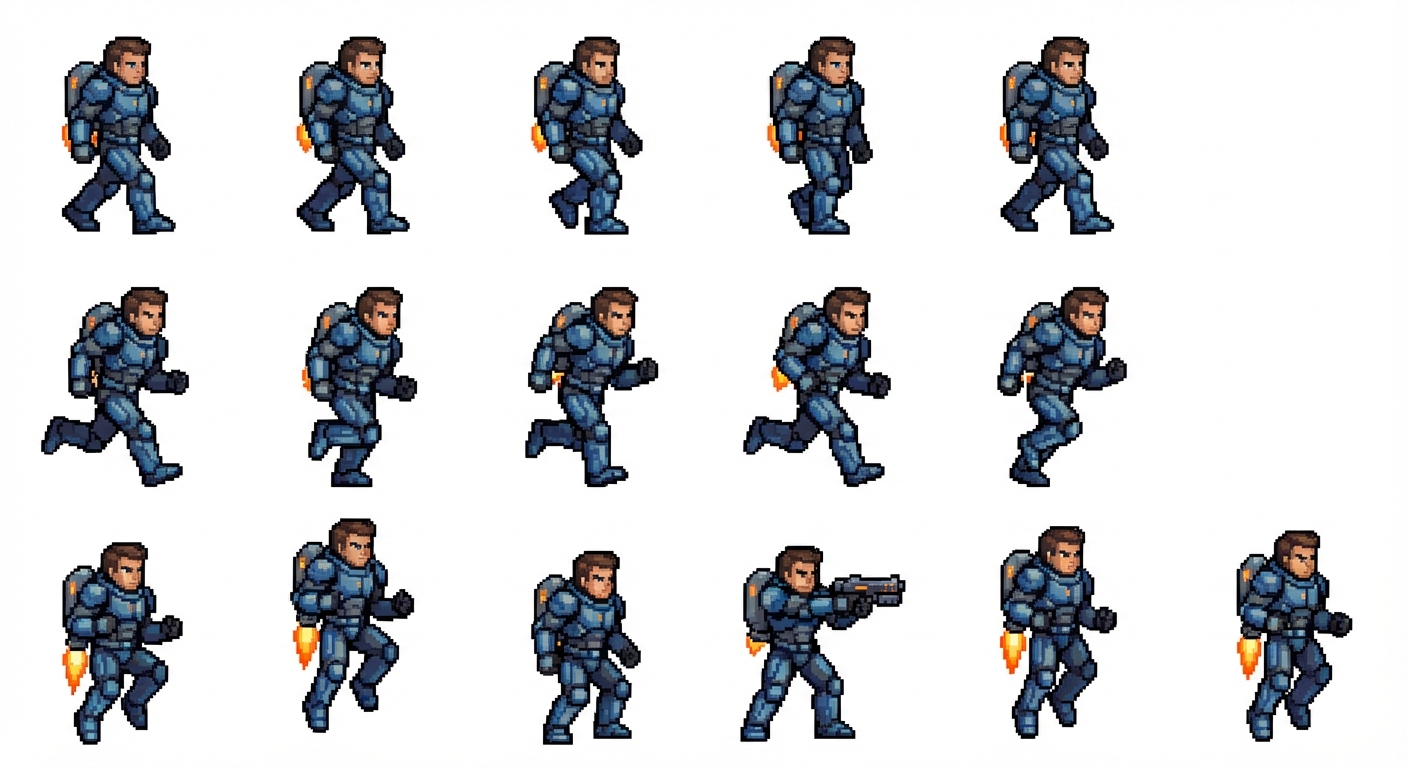 "a human player character, scifi-style, equipped with a hitech-combat-suit including a jetpack to hover, animations for walking, running, jumping, shooting and using the jetpack, in Pixel Art style"