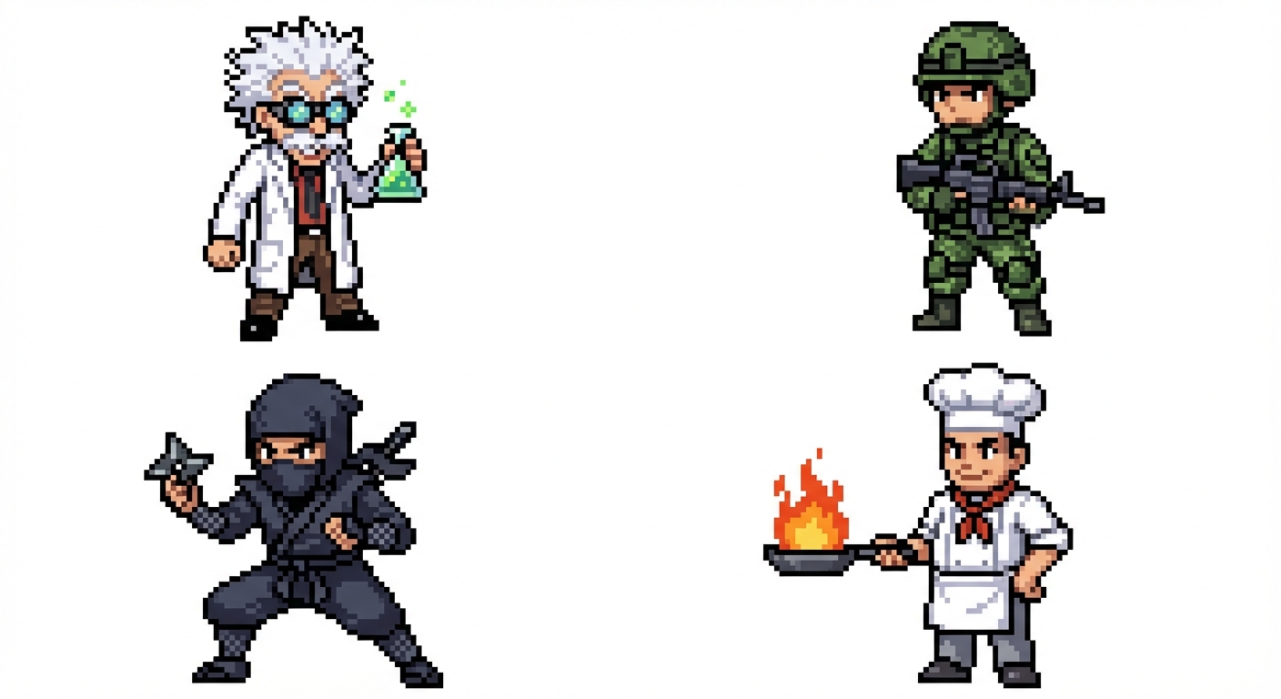 "Grid of various 56x56px Pokemon trainer battle sprites sprites. Mad scientist, soldier, etc"