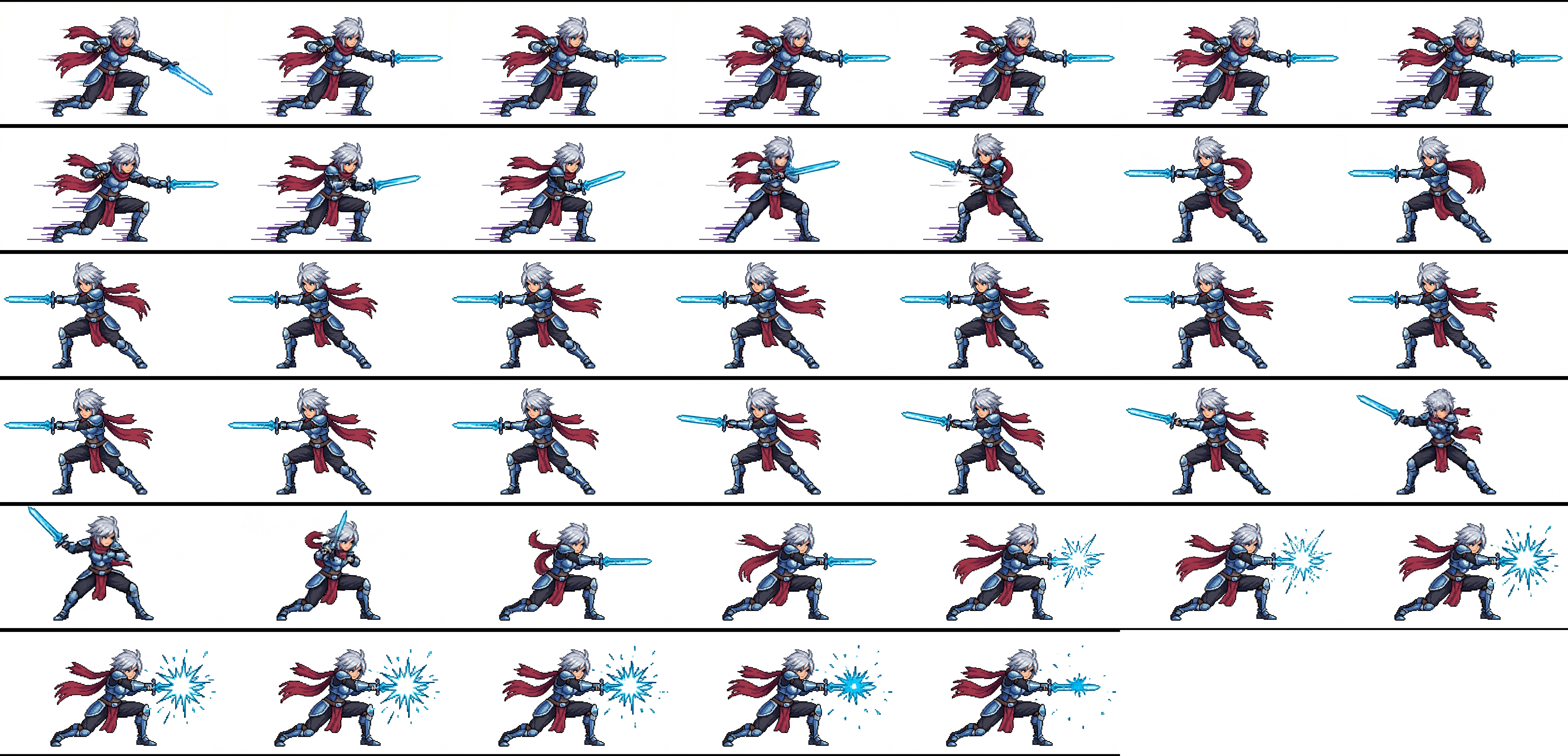 "2D sprite sheet of a stylish female fighter with short silver hair, light armor and a flowing scarf. Clean anime-pixel style, strong silhouette, readable proportions. Animation shows a perfect dodge backward at the last second, brief slow-motion pose with motion blur, then a fast counter slash with a sharp impact effect. Neutral background, consistent character size, smooth and snappy timing."