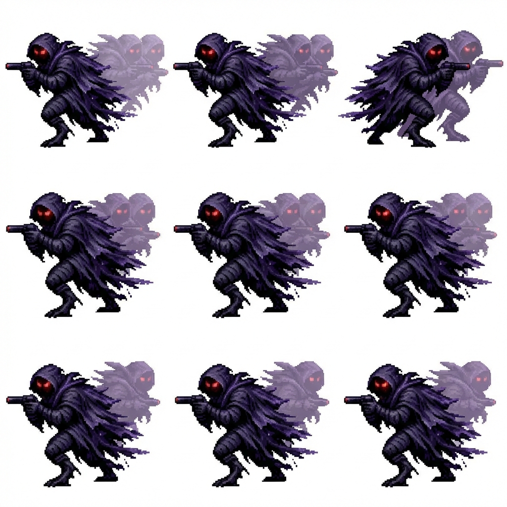 "THE WRAITH (Precision/Stealth) Starting Weapon: Suppressed Pistol | Archetype: Ghostly assassin Visual Design (65×75px) Table Copy Element Design Choice Silhouette Slender, hunched posture — suggests speed and elusiveness Head Hooded cloak with empty void where face should be; faint red glow from within Body Tattered trench coat that "flickers" at edges (transparency animation frames) Arms Long, almost skeletal — weapon held close to body Legs Digitigrade stance (on toes), ready to sprint Color Palette Charcoal black, deep purple shadows, blood-red accent glow Animation States Idle: Subtle "breathing" flicker, hood swaying Movement: Low crouch-run, coat trailing with motion blur frames Weapon Fire: Quick, minimal recoil — flash suppressed to dull red spark Corruption Progression: Hood dissolves revealing skull; coat becomes more tattered/ ethereal Distinctive Trait Ghost-trail effect on dash — leaves 2-3 fading afterimages"