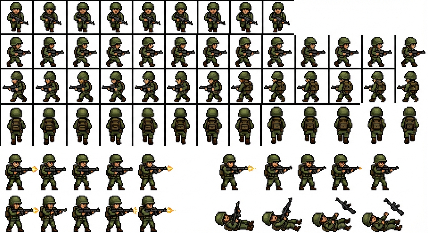 "16-bit pixel art soldier sprite sheet, arcade run-and-gun style, similar to classic 2D war shooters. Side-view 4-direction character sprite sheet (DOWN, LEFT, RIGHT, UP), not top-down. TECH: 32x32 pixels per frame, strict 16-color palette, 1-pixel black outline, strong internal shading, no anti-aliasing, pure white background. PROPORTIONS: Realistic tiny soldier, big rounded helmet and small body, about 20 pixels tall, 13 pixels wide, short legs and arms, readable silhouette at low resolution. UNIFORM: Dalai Farmers faction, olive green uniform (base #556B2F, shadow #3D4F1F, highlight #6B8E23), matching olive helmet, dark boots, brown belt and pouches, brown rifle with black barrel always visible when aiming. LAYOUT: Row 1 – WALK DOWN: 8 frames of the soldier walking toward the camera, gun held across the chest. Row 2 – WALK LEFT: 8 side-view frames walking left, body in profile, rifle pointing forward. Row 3 – WALK RIGHT: same as walk left but mirrored. Row 4 – WALK UP: 8 frames walking away from camera, backpack visible, rifle on the back. Row 5 – SHOOT DOWN: 4 frames standing and firing toward the camera. Row 6 – SHOOT LEFT: 4 side-view firing frames to the left. Row 7 – SHOOT RIGHT: 4 side-view firing frames to the right. Row 8 – DEATH: 4 frames of death animation, soldier falling sideways to the ground with rifle dropping. LIGHTING: single light source from top-left, consistent on all frames and directions, strong highlights on helmet and shoulders. STYLE: Clean readable 16-bit console sprite, same style as classic pixel soldier sprite sheets, ready for use in a retro war game. --v 6.0"