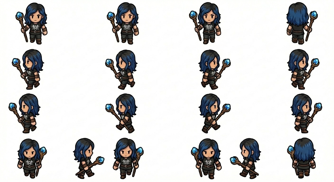 "can you make the character a young adult female, with shoulder length two-colored hair, black and blue colored. wearing a "Sleep Token" band tee"