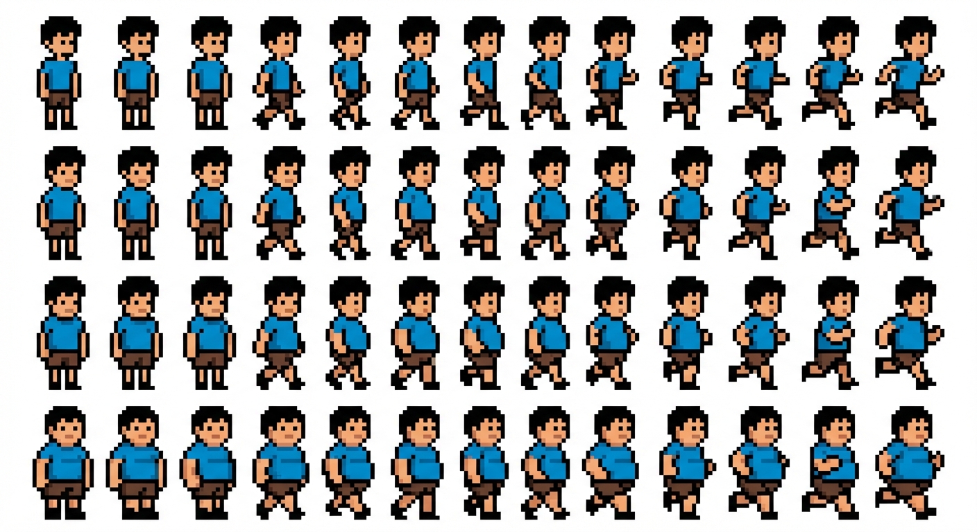 "Pixel art style, sprite sheet, side view. A boy in stages of increasing obesity. with multiple versions for animations; idle - walk - run, in Pixel Art style"