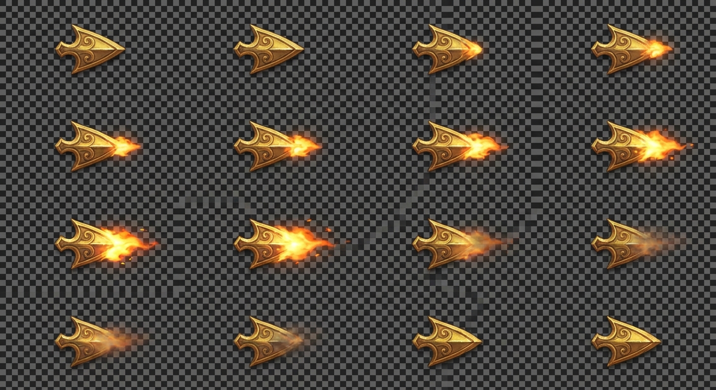 "Create a high-quality World of Warcraft–style fantasy mouse cursor sprite sheet with 16 frames (4x4 grid) on a transparent background (PNG with alpha). Style / look: Matches classic WoW UI cursor vibe: golden ornate metal arrowhead, slightly chunky, hand-painted RPG UI style Crisp edges, strong readability at small size Subtle shadow/ambient occlusion baked into the cursor (very light), no big drop shadow Frames / animation: Frame 1 (top-left) = idle cursor (no fire, clean gold arrow) Frames 2–16 = click animation: Cursor looks slightly “pressed”/snapped forward Short fire burst appears at the tip/front of the cursor Fire builds up quickly, peaks mid animation, then fades out by last frame Keep cursor shape consistent; only slight squash/press + fire motion No random noise, no spark columns, no artifacts on the background Technical: Output: PNG, transparent background Sheet layout: 4 columns x 4 rows Each frame: 256x256 px (or 128x128 if you prefer), same padding every frame Cursor centered consistently in each frame, aligned for stable animation"
