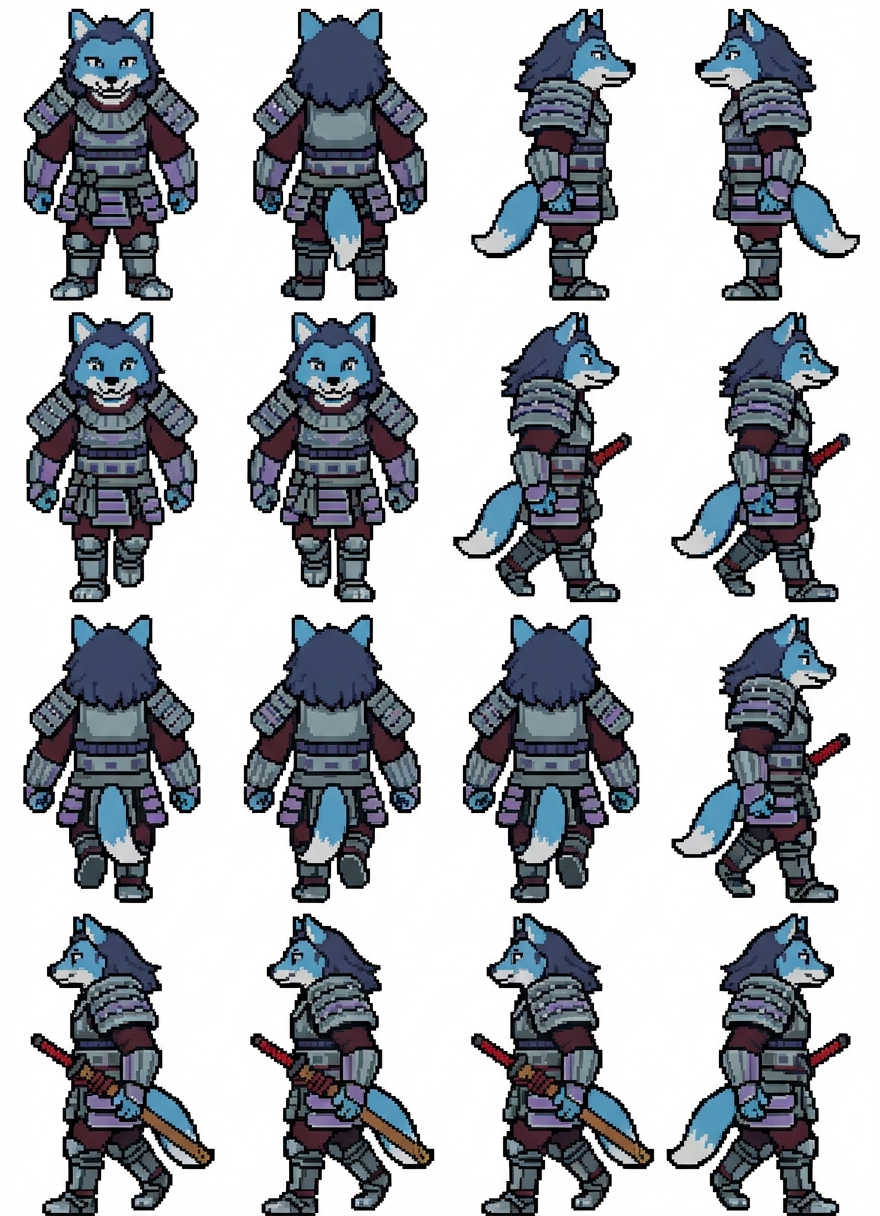 "32x32 pixel art sprite of blue fox samurai, front view, back view, left view, right view, Undertale style, simple shading, clean black outlines, 4-direction sprites, in Pixel Art style"