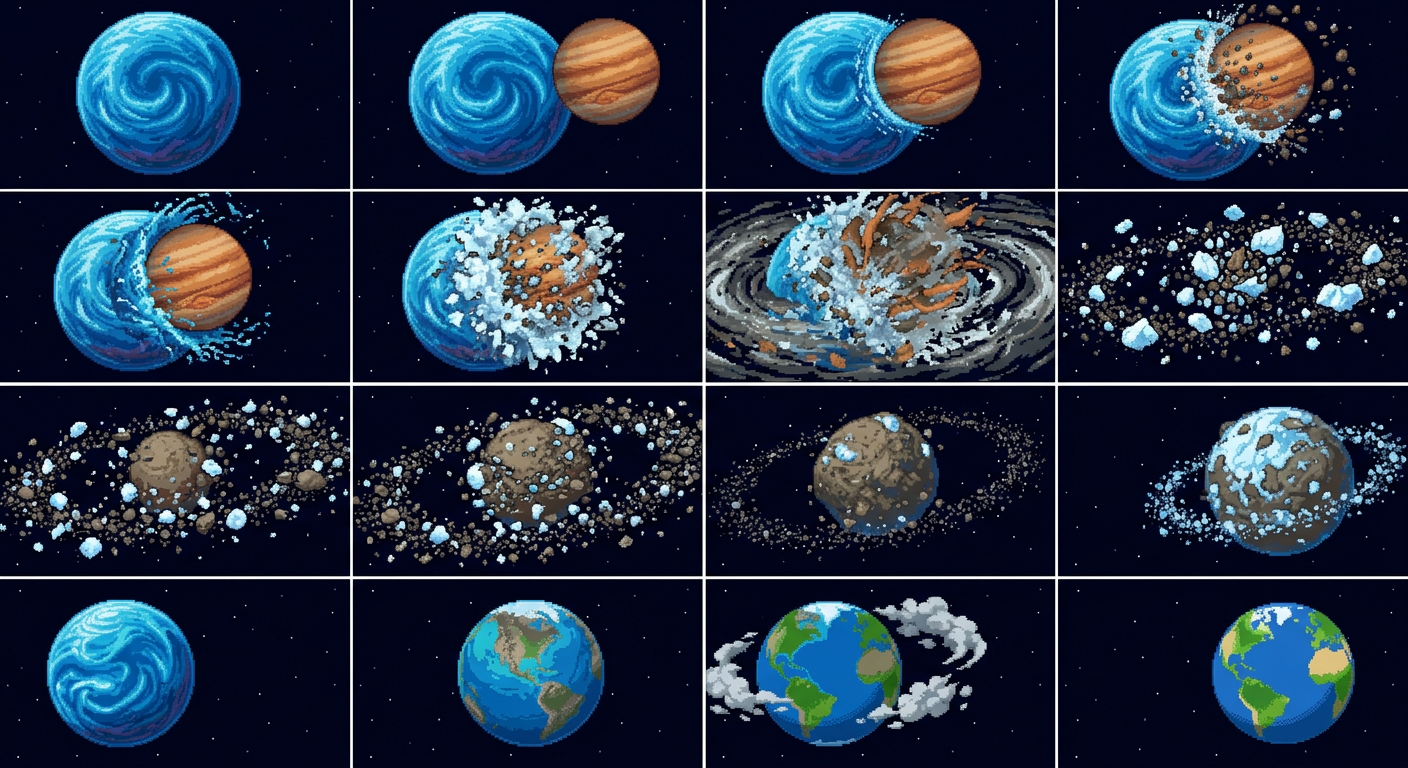 "a giant water planet suffers a cataclysmic event as a separate giant gas planet crashing straight into the water planet leaving ice and rock debris in its wake and then the debris come together and create a tiny water planet called earth, in Pixel Art style"