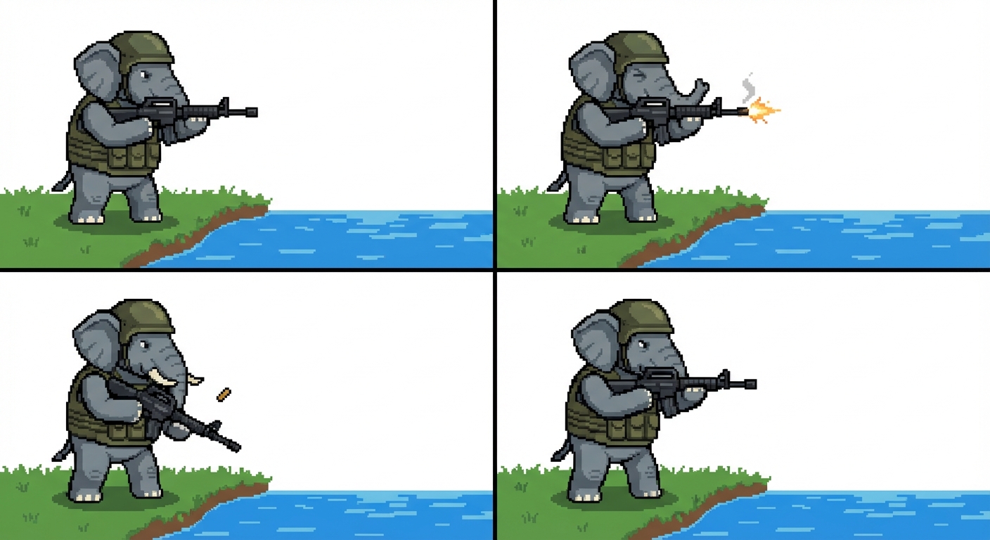 "generate a elehpant with a rifle shooting a lake "