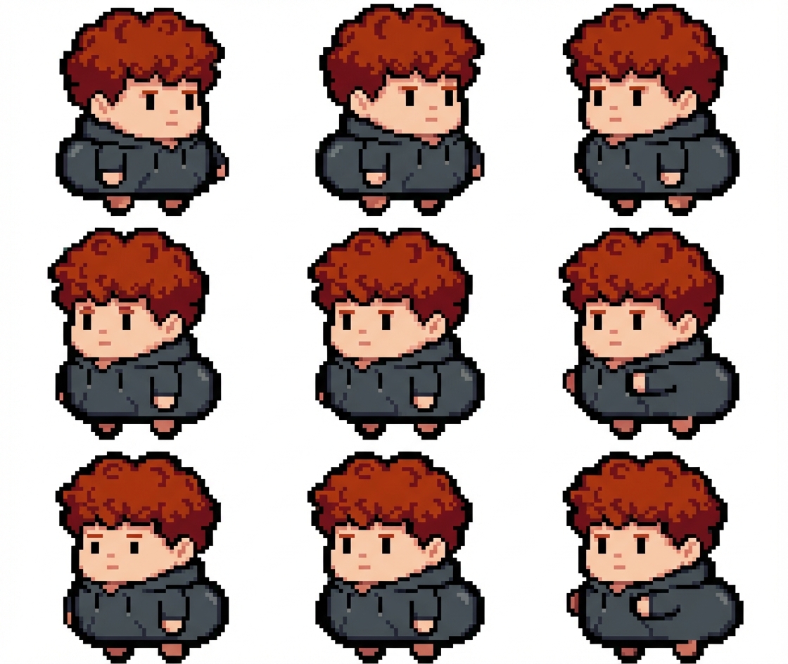 "ein 2d pixel art von der peson. die beine sollen im verhältnis zum oberkörper eher klein sein damit das pixelart niedlich aussieht. er soll einen grosen arsch haben"