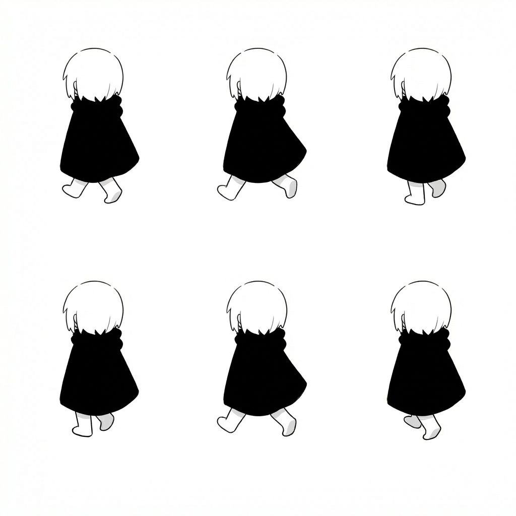 "1girl, mamei mema, white short hair, black cloak, mage, barefoot, walking, back, backwards, isometric, isometric angle, black and white, monochrome, monochromatic,"