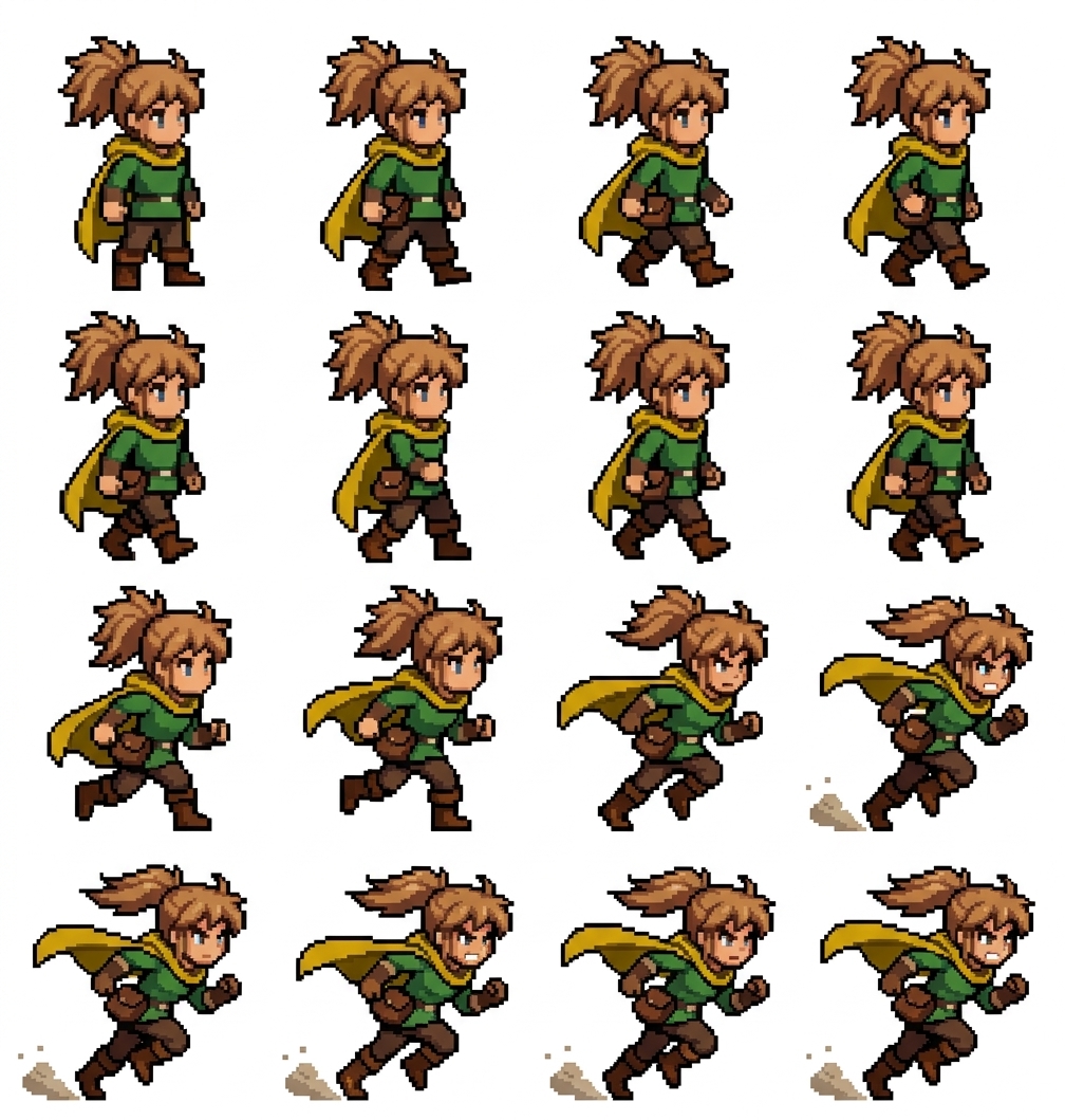 "the 1st image is the original character but change its looks base on the 2nd pasted image and make it a 2d pixel animation of walking and a sprinting animation, in Pixel Art style"