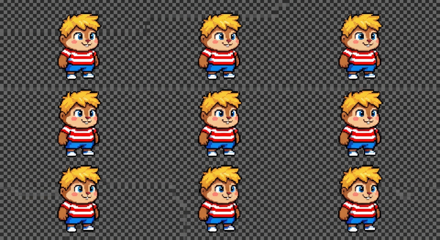 "A cute young boy named Tommy, pixel art style, chubby chipmunk-like face, big bright blue eyes, short messy blonde hair, rosy cheeks, wearing a red and white striped t-shirt and blue shorts, white sneakers, small and round body, friendly and energetic expression, 2D platformer game character sprite, front-facing idle pose, transparent background"