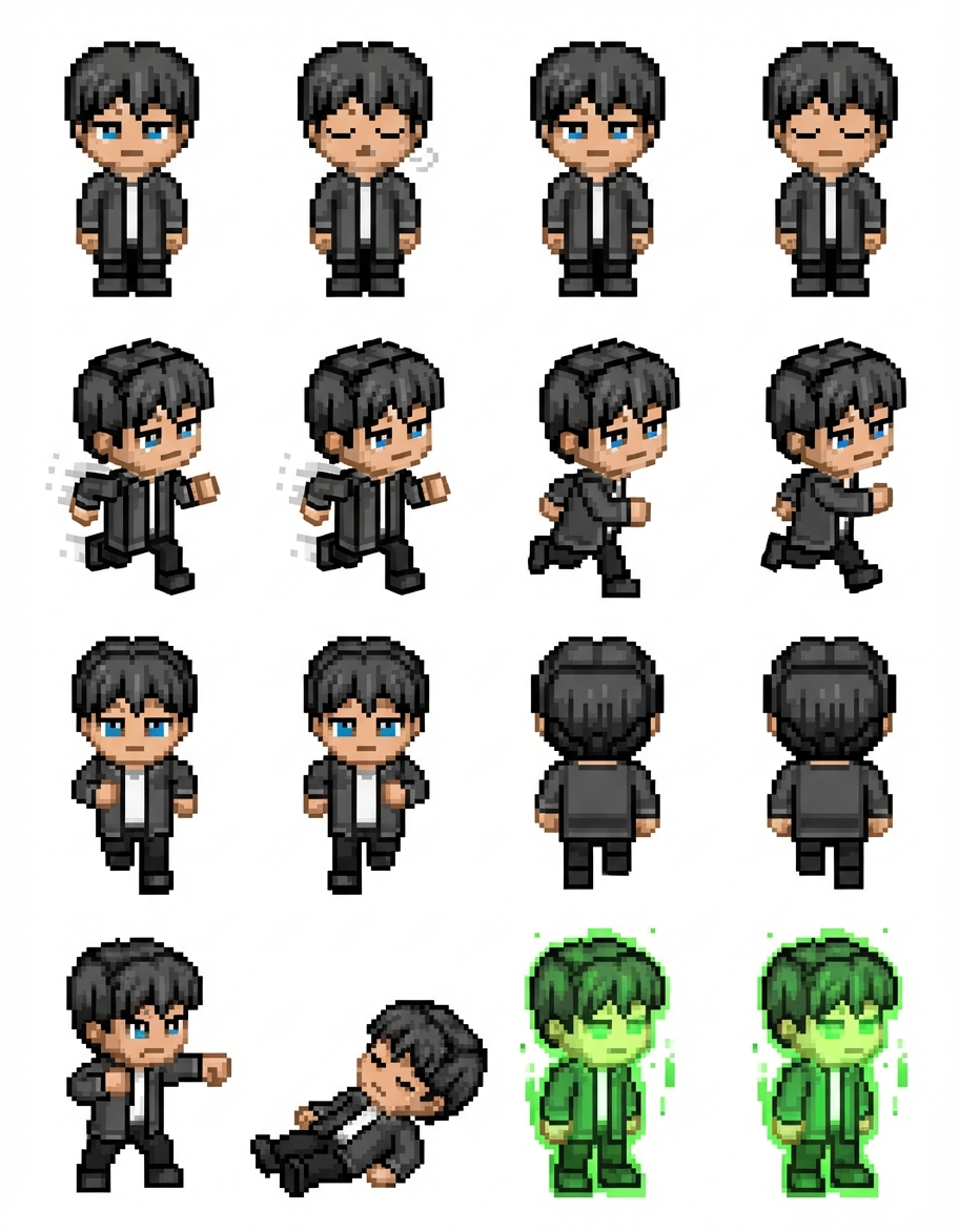 "can you please make an sprite of this 2d character, i want idle attack run side to side, front and back run and i want the die animation and heal animation. thank you"